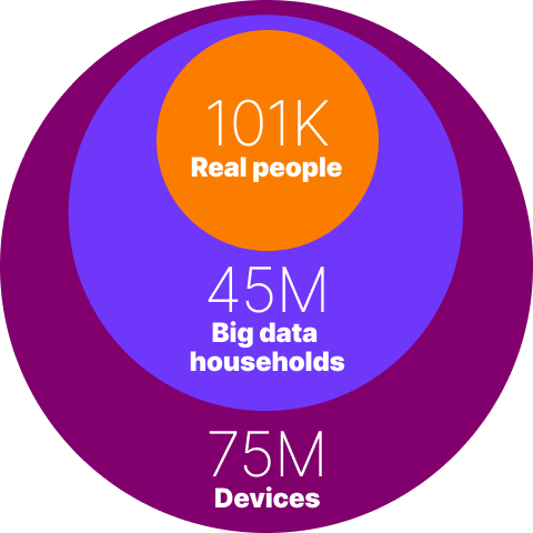 Nielsen’s data scientists validate hundreds of millions of data points and billions of impressions across screens against information from the real people who make up our panel, correcting for biases and other gaps in the data. This yields a person-level measurement that is representative of the larger population at scale. Discover the deepest view of audiences today with Big Data + Panel integrated into Nielsen’s products for national and local TV measurement, as well as cross-media measurement.